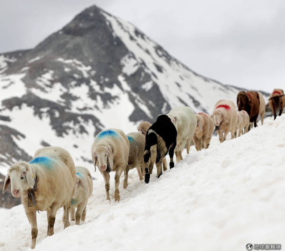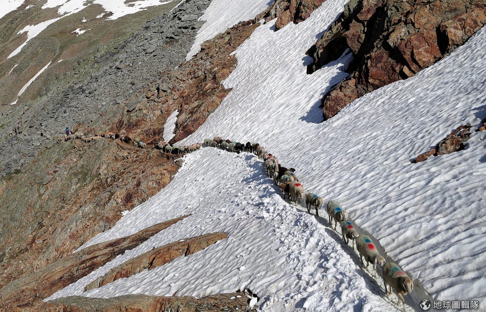 在Hochjochferner冰河上,羊群們正在探尋可以行走的路徑。