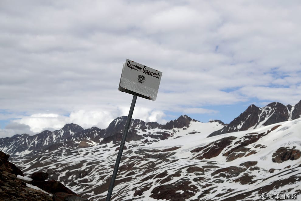 在這塊告示牌上,標示著這裡是義大利和奧地利兩國的交界處。