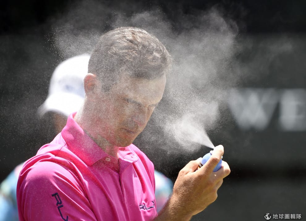 圖為 2015年5月,高爾夫球選手霍雪爾(Billy Horschel)拿起一罐防曬噴霧往臉上噴。
