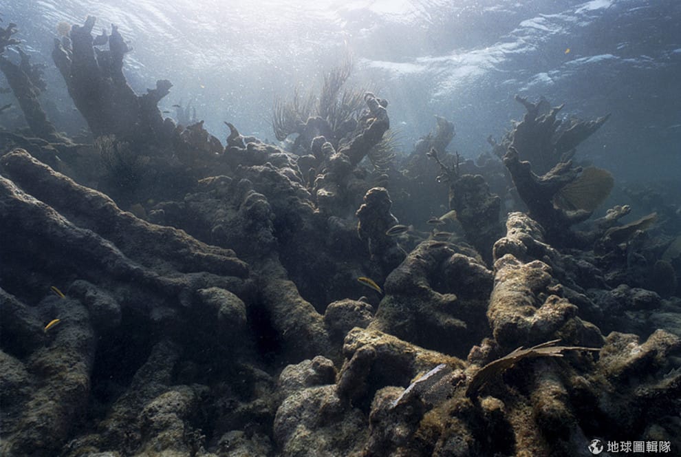 圖為考克島(Caye Caulker),海底的珊瑚礁因為全球暖化的關係出現白化。