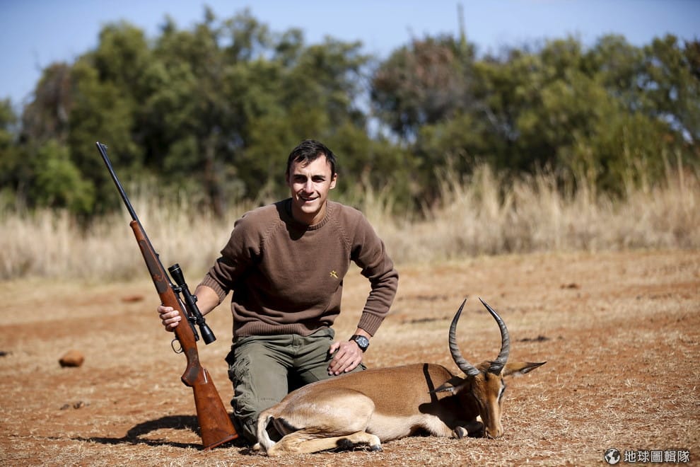2015年,一名參加戰利品狩獵活動的獵人,開心地在南非和射殺的羚羊拍照。