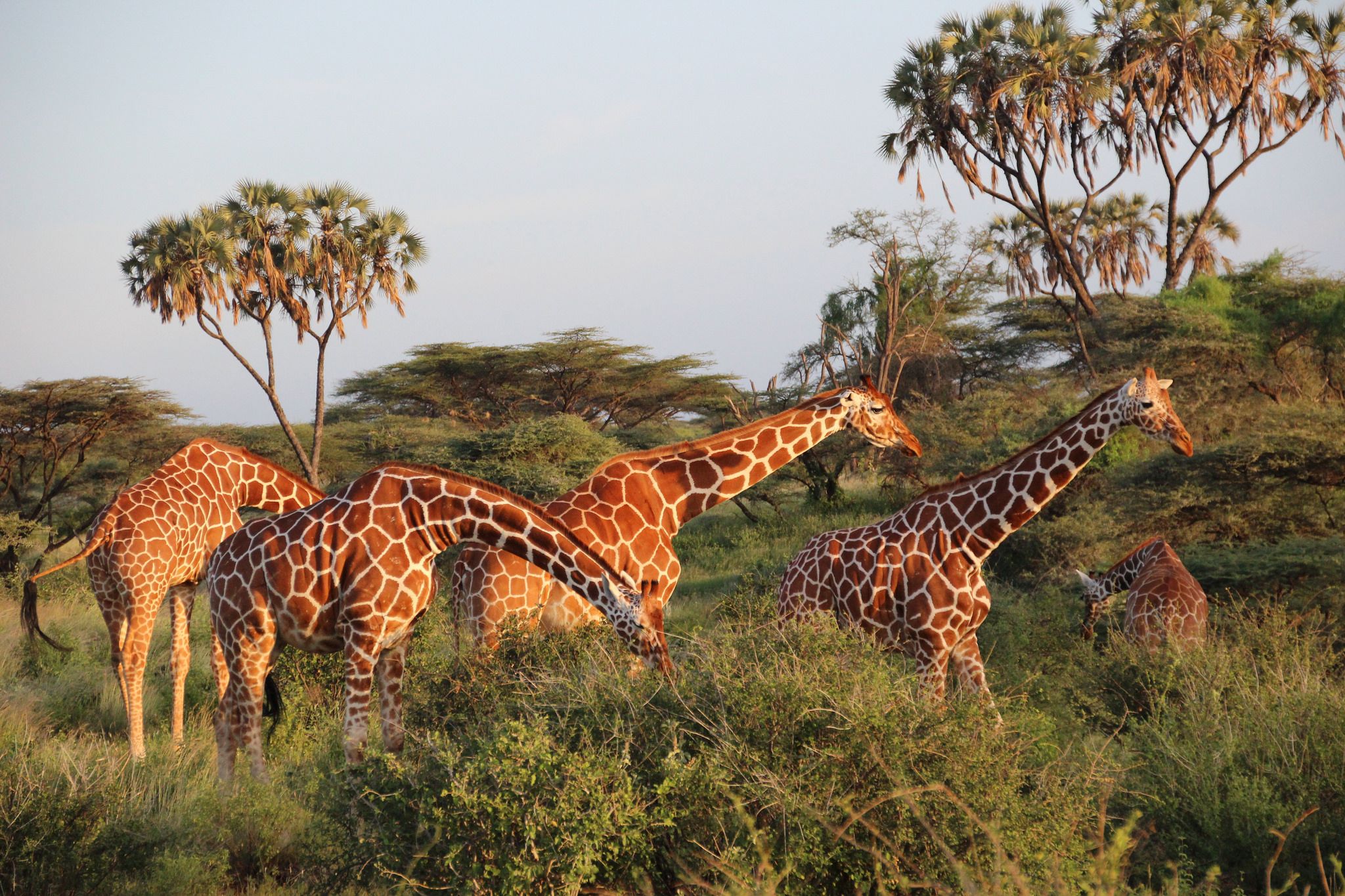 圖為一群在肯亞草原行走的長頸鹿。長頸鹿的年紀越大,毛色也會越深。