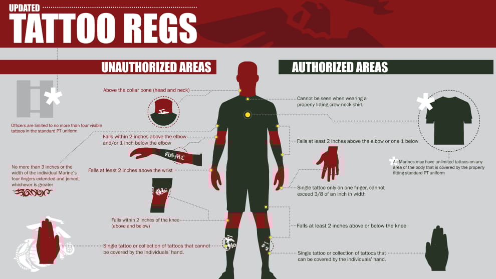 圖為美國海軍對於士兵,可以看到上面的規範包括露出的刺青面積不能太大、腿上的刺青大小不能超過一個手掌等等。