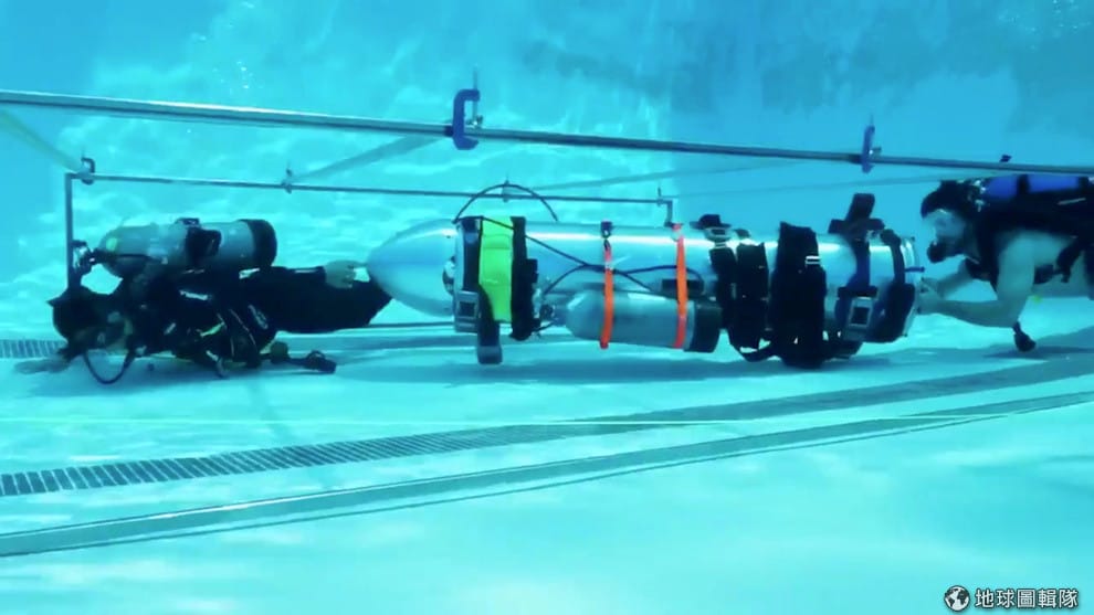 畫面中可以看到,馬斯克的「小孩潛艇」在游泳池中進行試驗的樣子──在「小孩潛艇」前後各由一名搜救人員帶領,或許就能讓足球隊員們脫離險境。