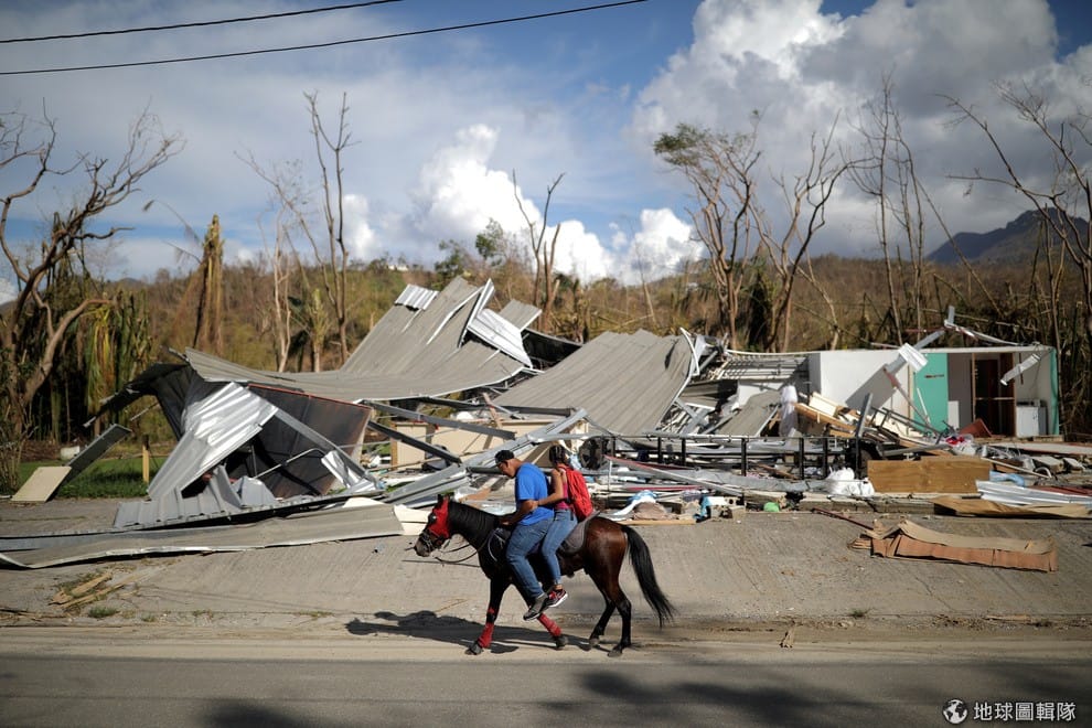 圖為 2017年10月,在受到颶風瑪麗亞重創的波多黎各中部城鎮哈尤亞(Jayuya),當地居民騎馬經過被颶風吹地歪七扭八的房舍。