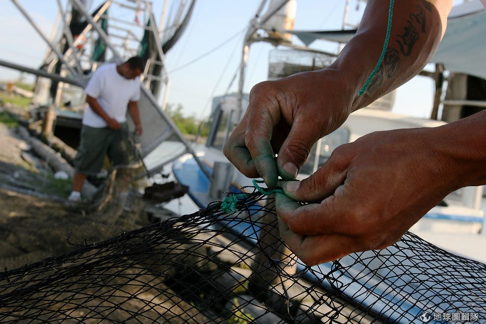 圖為 2010年5月,在美國路易斯安那州(Louisiana),一名漁夫在捕蝦季來臨前修補魚網。