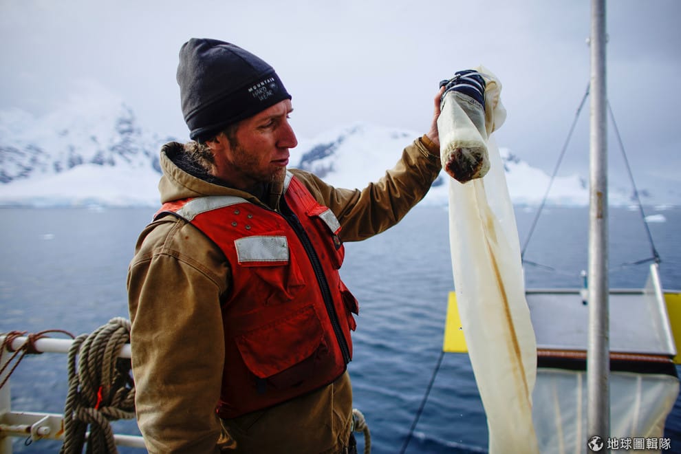 圖為今年 2月,在南極內科港(Neko Harbour),一名綠色和平組織的成員舉起用manta trawl拖網採集到的水樣品。