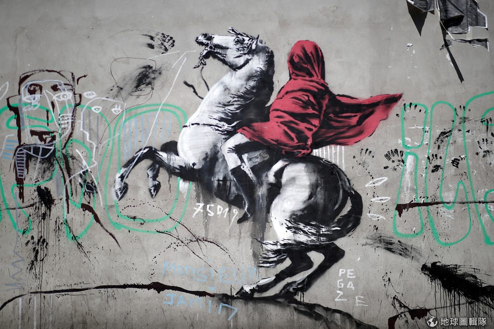 人們相信這一系列的塗鴉主題與歐洲各國如何對待移民息息相關,像在這張模仿了畫家雅克-路易·大衛(Jacques-Louis David)所繪製的《拿破侖翻越阿爾卑斯山》的塗鴉中,騎在馬背上的是一名被紅色伊斯蘭頭巾遮住臉的人,而這是針對法國政府在 2010年通過蒙面面紗尼卡布(niqab)的配戴禁令。