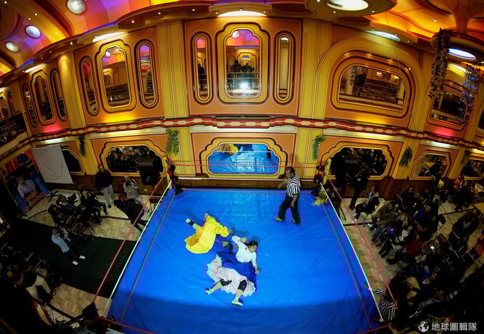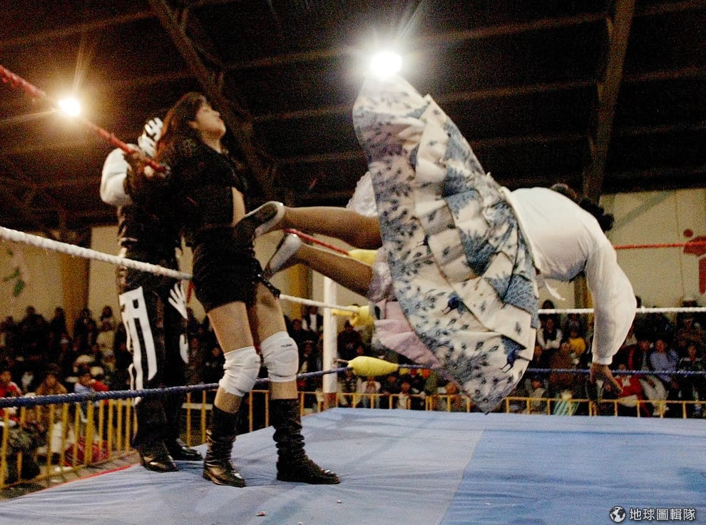 在摔角賽Cholita上,摔角手們正在擂台上互相較勁。