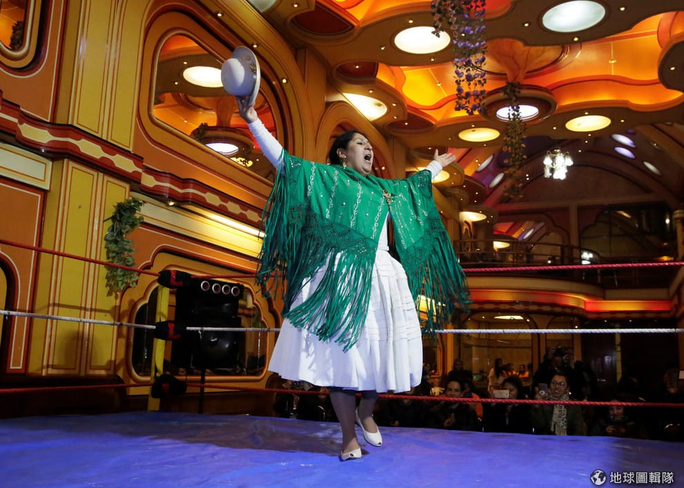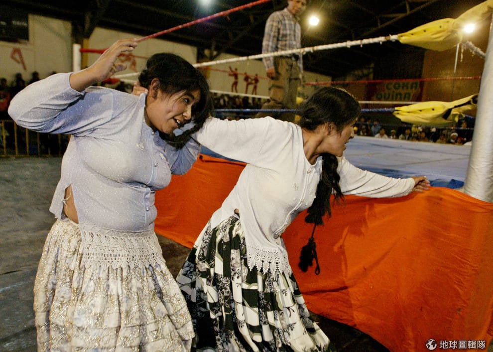 傳統褶邊裙、圓頂帽、辮子,此即為艾馬拉女性的傳統打扮,也是她們在擂臺上的標準衣著。
