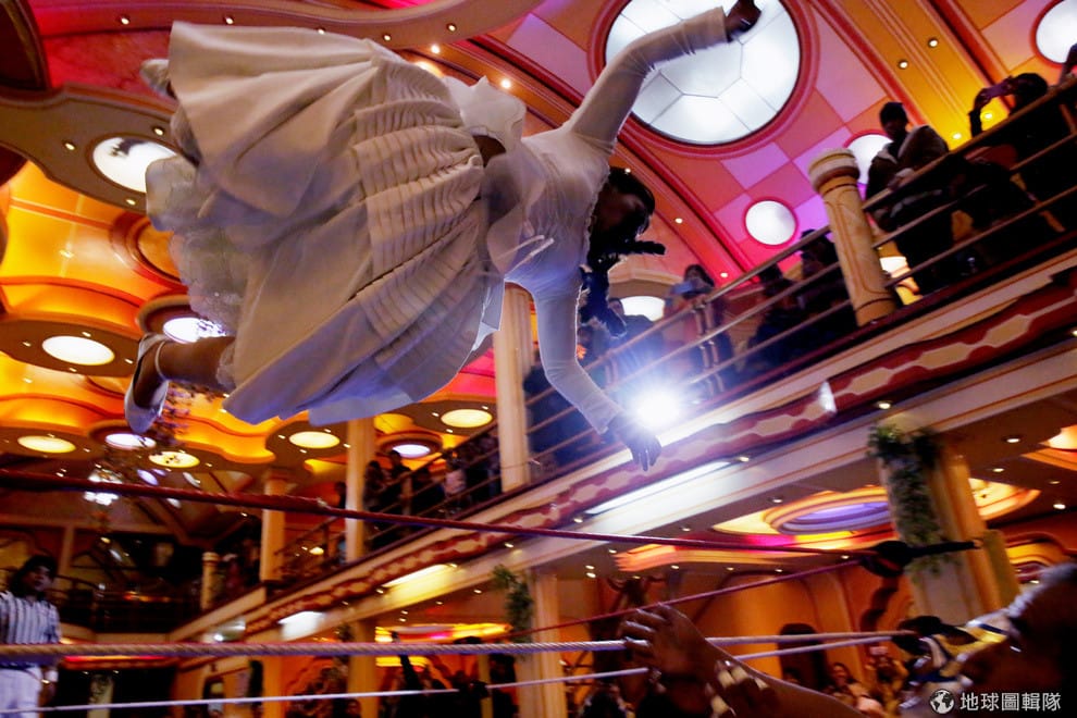 在剛入場時,你會看到這些摔角手舉止淘氣,帶著大大的笑容與觀眾互相打招呼——但用不了多久,她們就會化身搏鬥專家,用攻擊對手頭部、拉辮子、鎖喉等方式設法制服眼前的「敵人」。