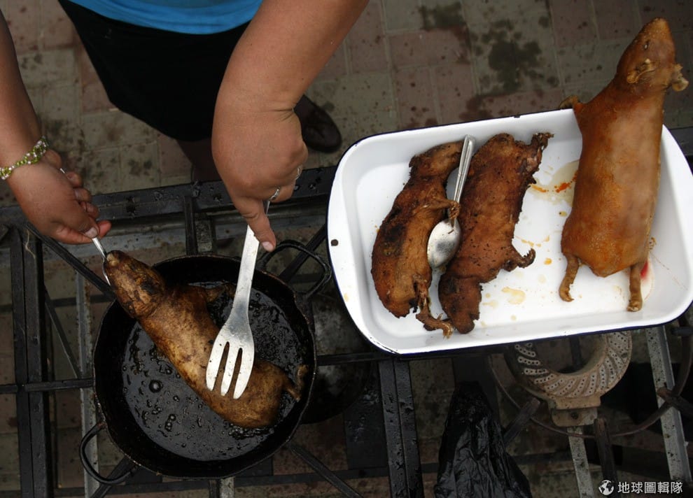 天竺鼠經過炸或烤之後,灑上香料,再搭配安地斯馬鈴薯和秘魯玉米吃。