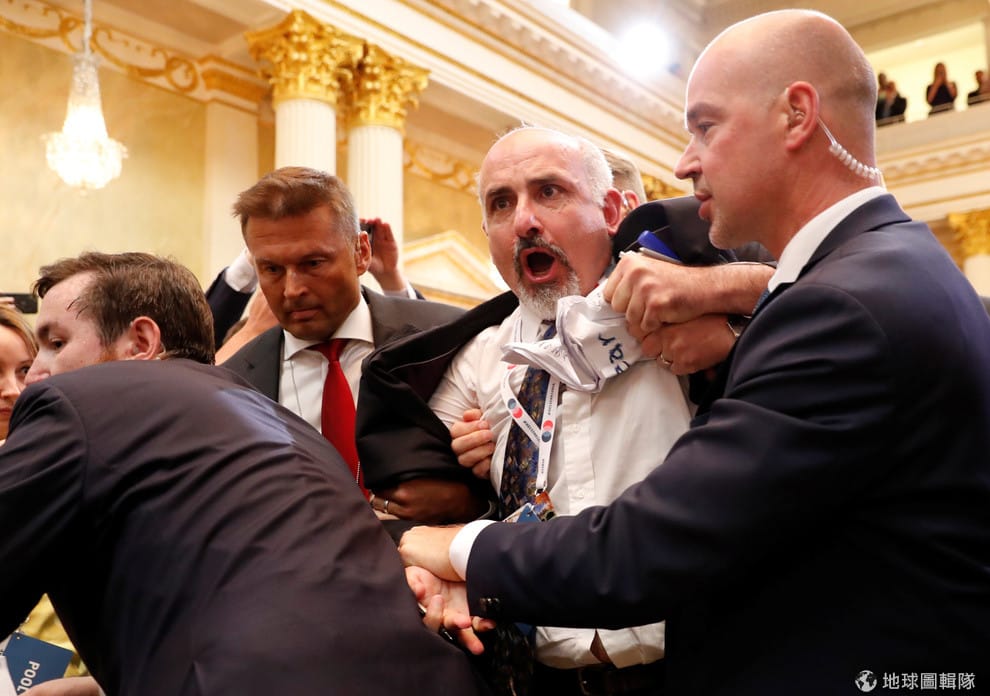 在川普和普亭召開共同記者會前,一名闖入現場的示威者遭到保安架離。