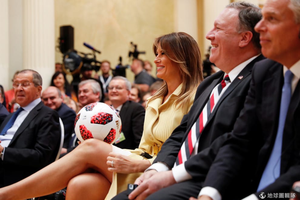 當川普收到了普亭的足球禮物時,便將足球拋給了坐在第一排的美國第一夫人梅蘭妮亞(Melania Trump)。