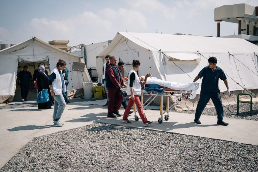 圖為無國界醫生組織在哈曼阿里勒的野外創傷診所,醫護人員正在搬運病患。