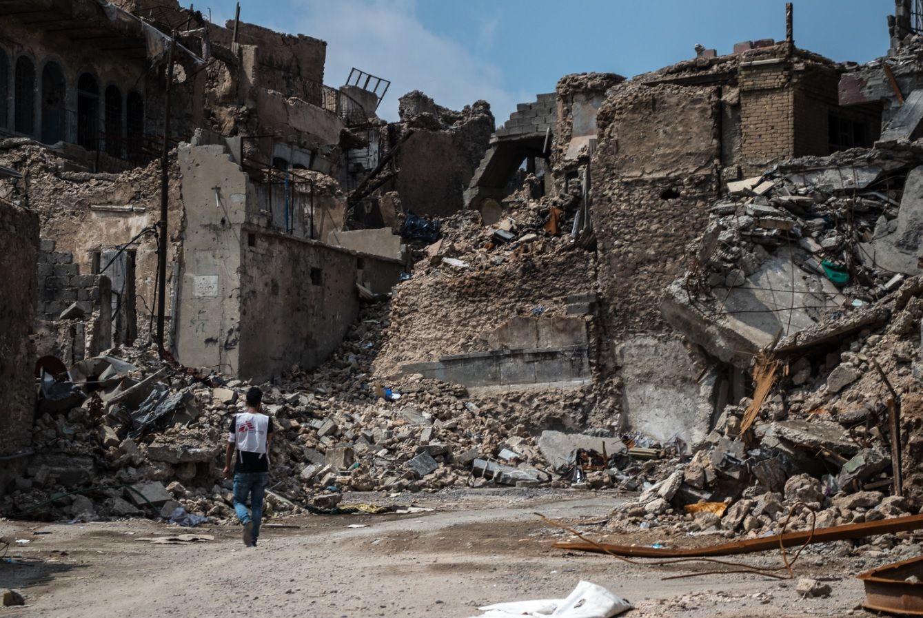 一名穿著「無國界醫生」組織背心的男子,走在面目全非的摩蘇爾城中。