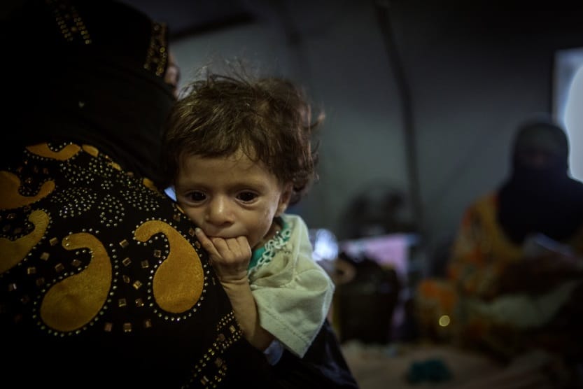 在蓋亞拉醫院內,只有 10個月大的賈瓦德(Jawad)趴在家人的肩上,他是嚴重急性營養不良的兒童之一。