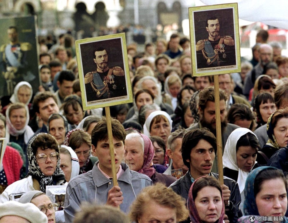 2000年8月,人們拿著末代沙皇尼古拉二世的畫像走上街頭,紀念他們一家在這天被封為聖徒。