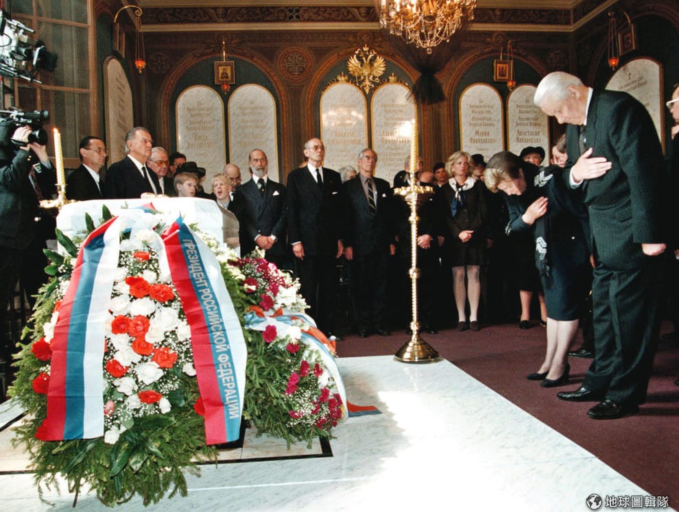 1998年8月在彼得保羅大教堂,俄國總統葉爾欽(右一)向末代沙皇尼古拉二世的棺木致意。