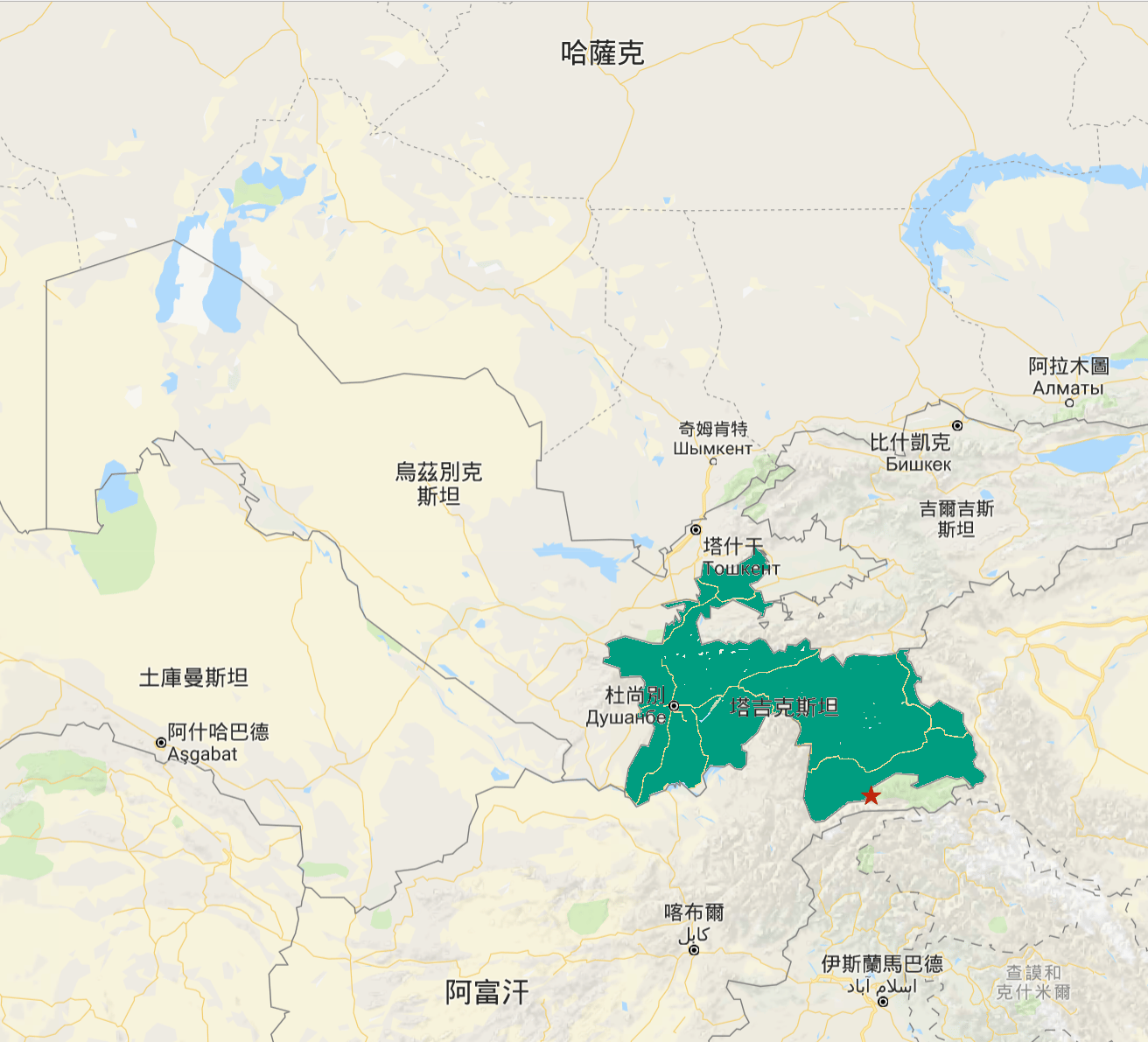 圖中綠色標記的地方,即為位於中亞的塔吉克所在處。紅色星號則為瓦罕走廊的概略位置。