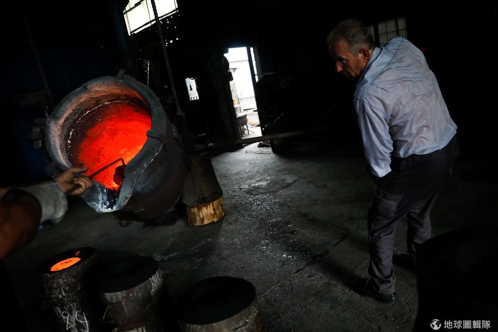 路透社弟弟克里斯托將熔融金屬倒進大小不一的模具裡,高溫的工作環境讓他的襯衫被汗浸溼。