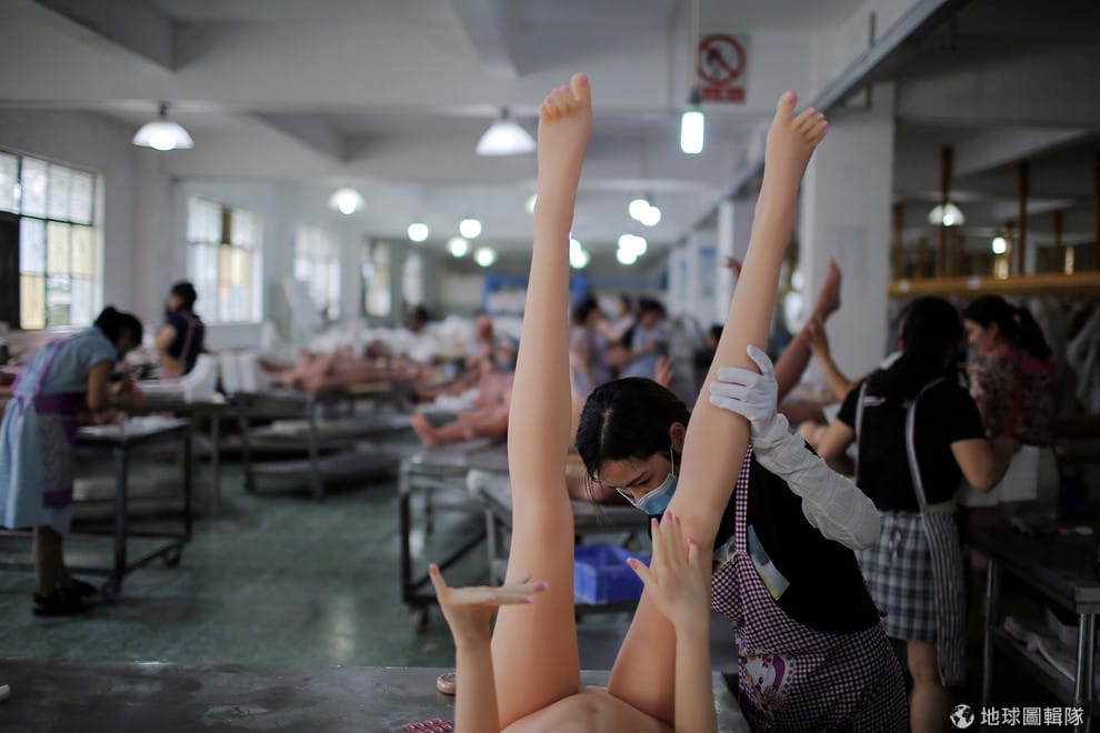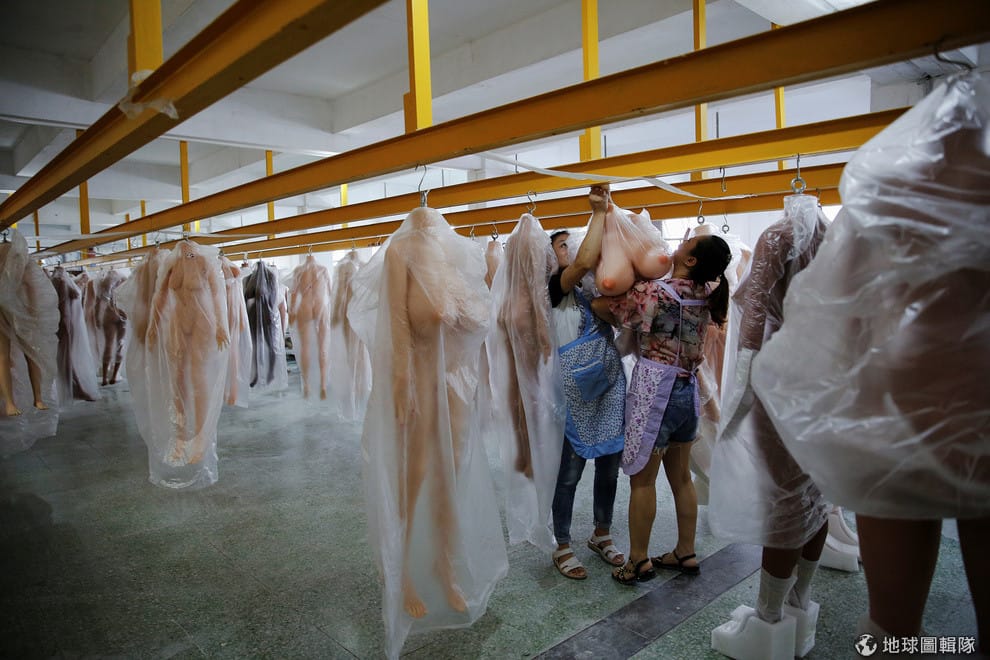 路透社在倉庫裡,工作人員合力將一尊性愛娃娃吊起來。放眼望去,可以看到不同身形、膚色的娃娃。