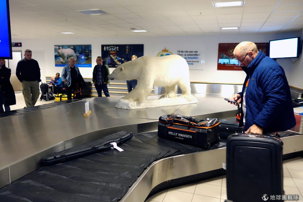 在斯匹茲卑爾根島上的機場,民眾在行李提領區可以看到一隻北極熊玩偶,顯示當地是野生北極熊的棲地。