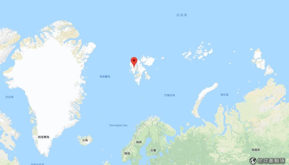 圖中紅色地標處,就是斯瓦巴群島中最大的島嶼──斯匹茲卑爾根島,也是北極觀光船常常停泊的地點,也是這次野生北極熊命喪槍下的地方。