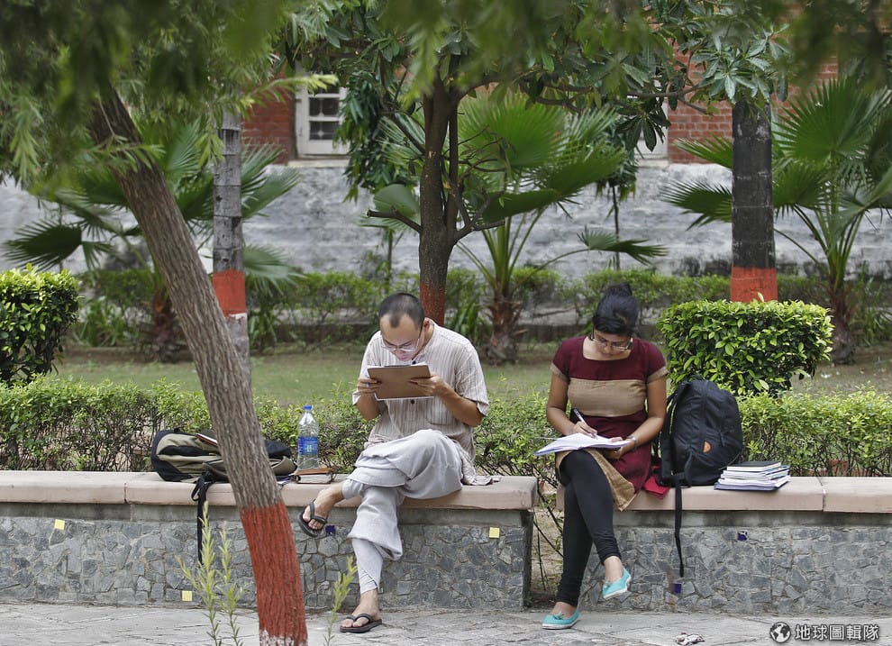 2013年10月在德里大學,兩名學生坐在校區內研讀著手上的東西。