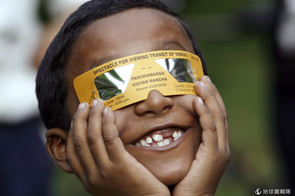 2008年8月,一名印度男童戴上了日食觀賞眼鏡,帶著大大的笑容欣賞眼前的日食景色。