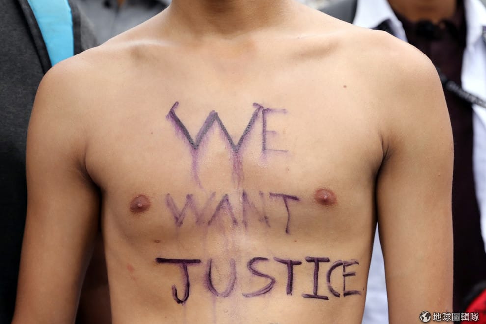 一名示威者在地板上寫到:「那些受過教育的人,(卻)遭到車子碾過。」