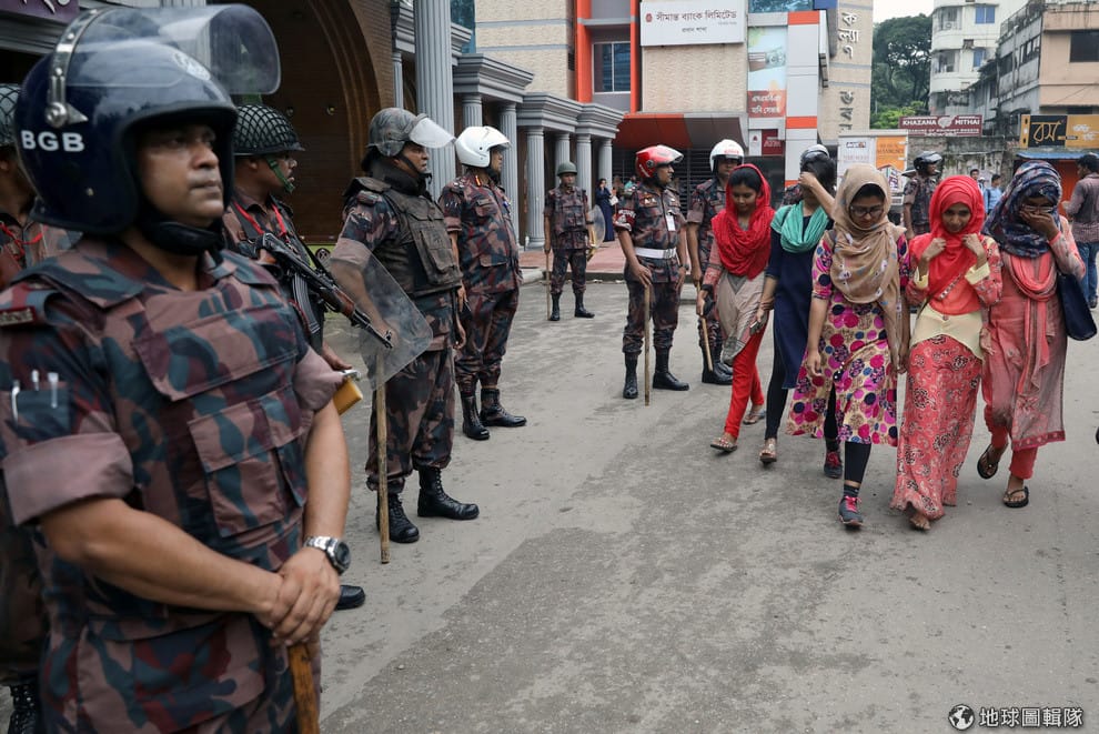 學生們在抗議結束後準備離開示威現場,一旁則是全副武裝的孟加拉邊境防衛部隊(Border Guard Bangladesh)。