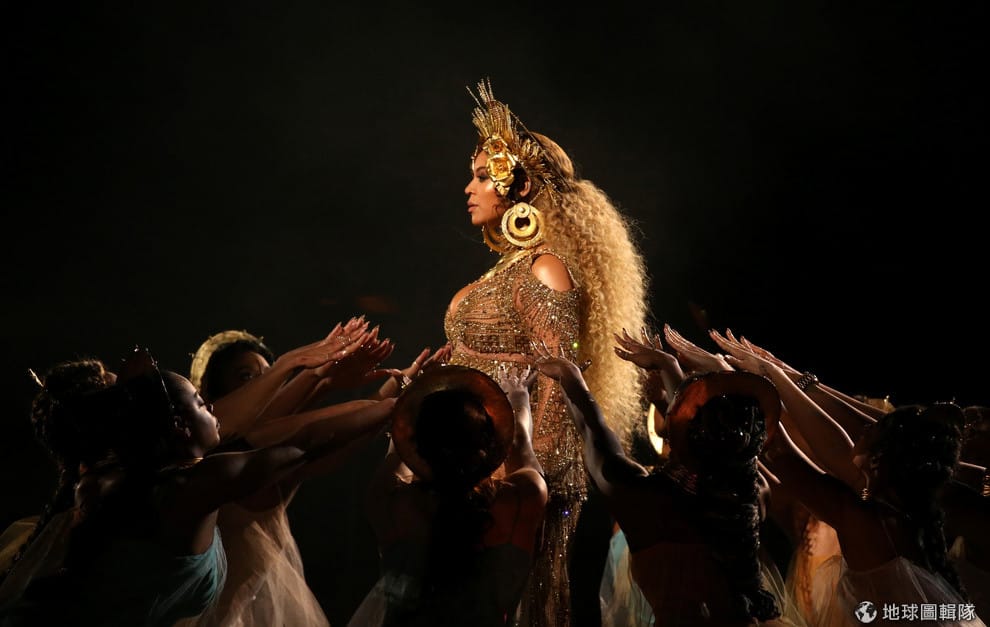 2017年第 59屆葛萊美頒獎典禮上,碧昂絲以融合非洲、印度教、羅馬神祉的裝扮,正在舞台上表演著。