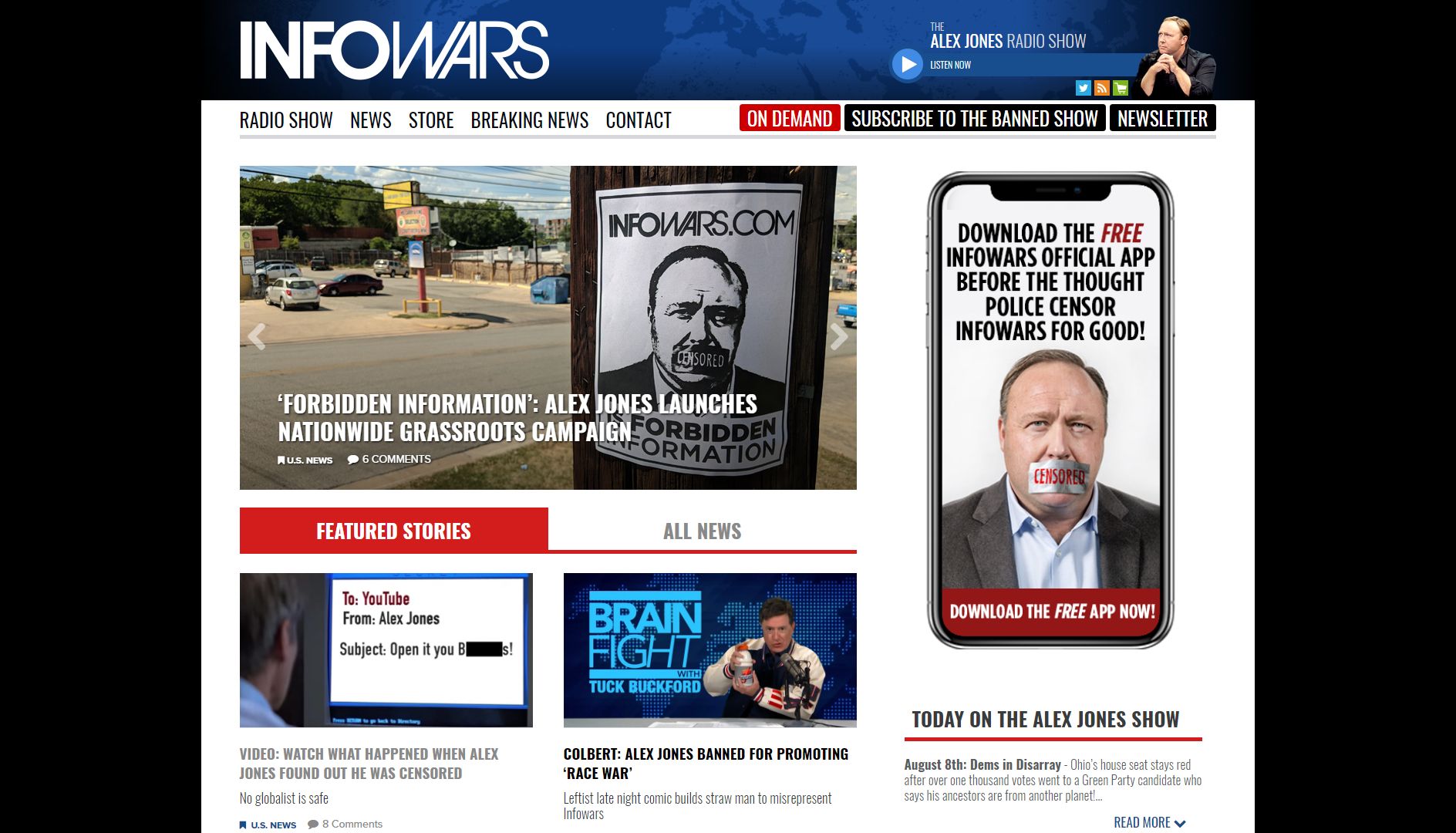 圖為《資訊戰》網站截圖。由於各大社群媒體接連封鎖瓊斯和《資訊戰》,意外讓《資訊戰》APP衝上App Store熱門下載排行榜。