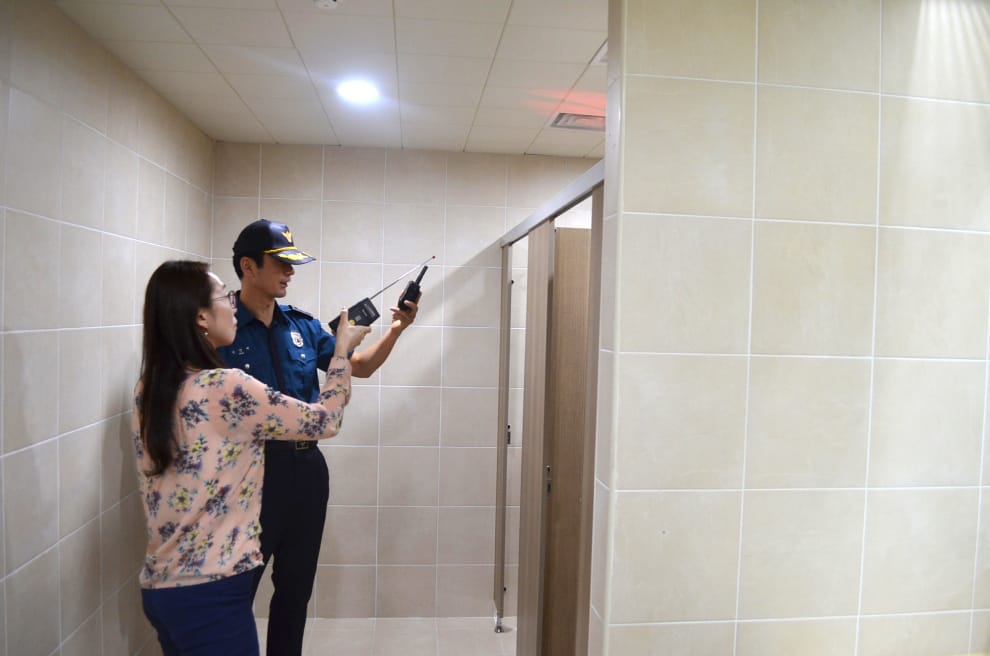 一名南韓警方的調查人員正在搜尋廁所裡是否藏有隱藏式攝影機。不論是馬桶、空調系統、門邊,都可能是被安裝針孔攝影機的地方。