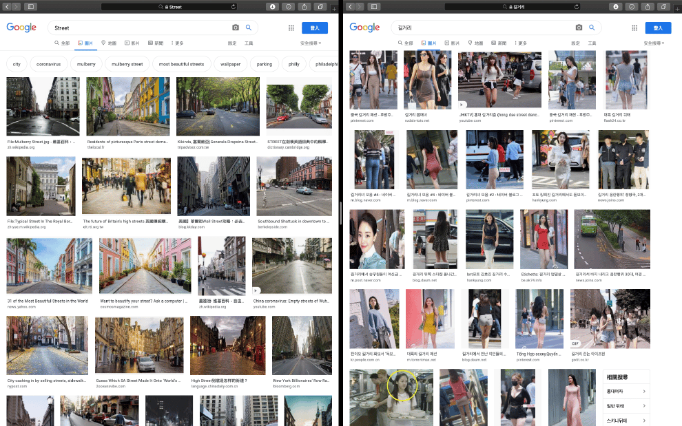 在Google上,如果你用「英文的街道」跟「韓文的街道」下去搜尋,會得到完全不一樣的結果。示威者相信,這也是反應出南韓偷拍現象嚴重的縮影。