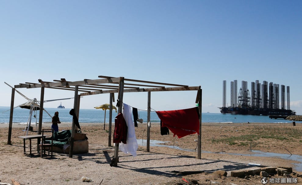圖為 2017年10月,在亞塞拜然首都巴庫(Baku),一名男子在裏海沿岸曬衣服,遠處還能看到在裏海海域上的石油鑽井機。
