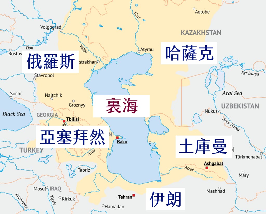 在蘇聯垮台後,裏海沿岸一共有俄國、伊朗、哈薩克、亞塞拜然和土庫曼等五個國家。