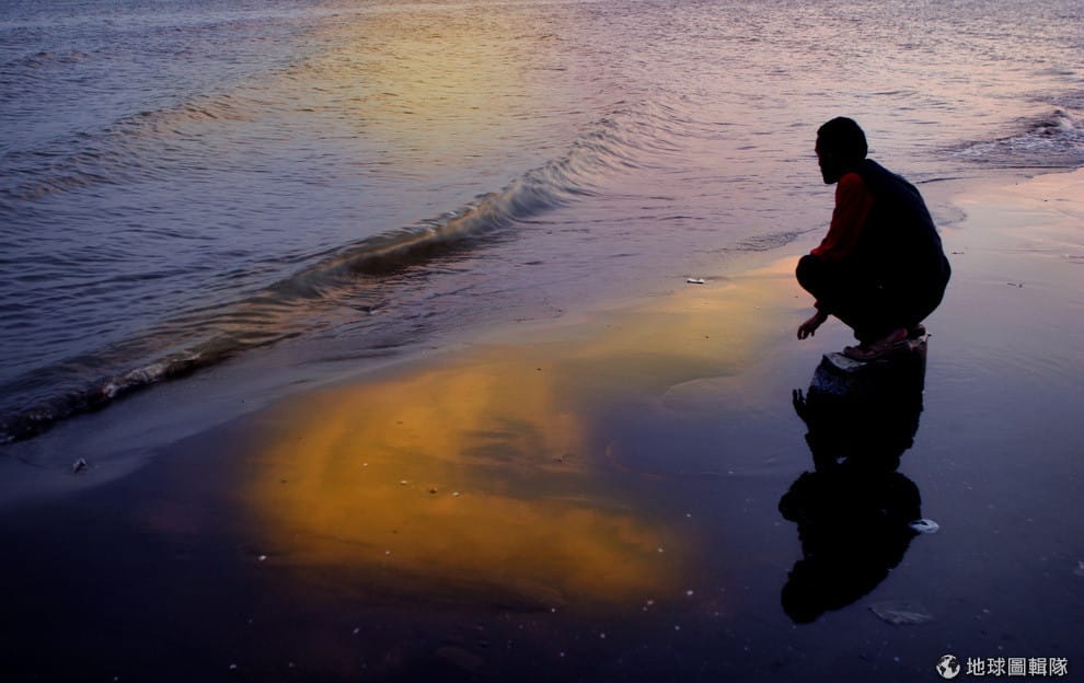 圖為 2005年3月,在伊朗薩里市(Sari),一名伊朗男子在日出時蹲坐在裏海岸邊。