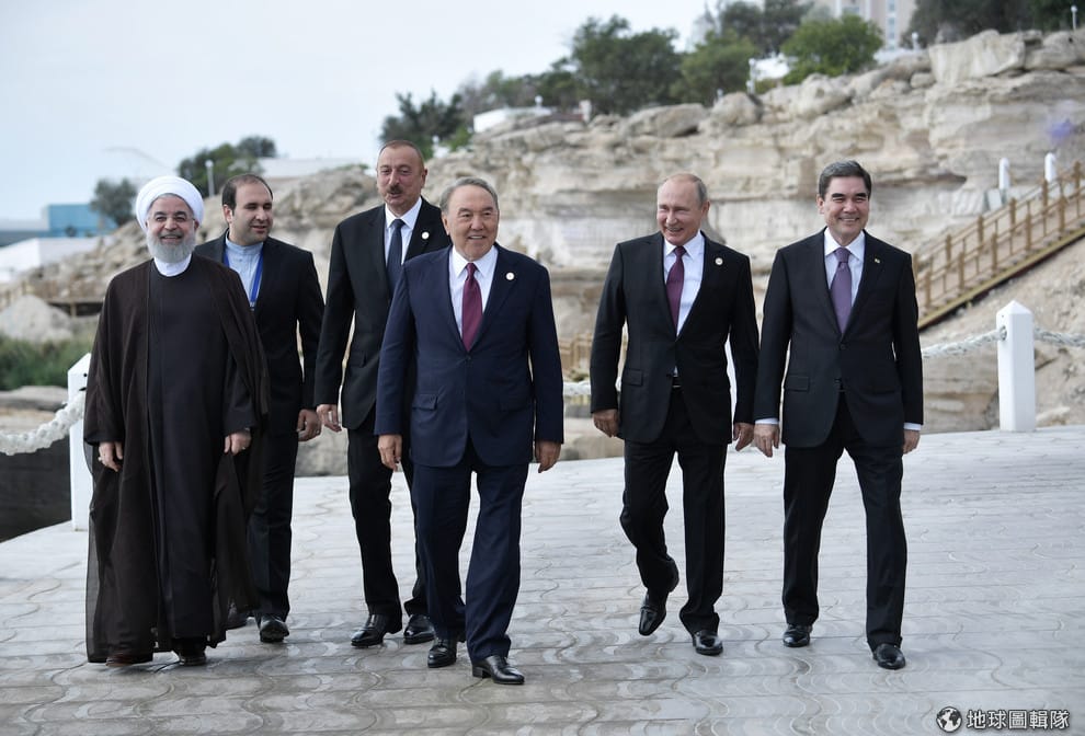 網友Redgeographics圖為 12號,剛參加完第五屆裏海高峰會的國家元首邊走邊聊,由左至右分別是伊朗總統魯哈尼(Hassan Rouhani)、亞塞拜然總統阿利耶夫(Ilham Aliyev)、哈薩克總統納扎爾巴耶夫、俄國總統普亭(Vladimir Putin)和土庫曼總統別爾德穆哈梅多夫(Gurbanguly Berdymukhamedov)。