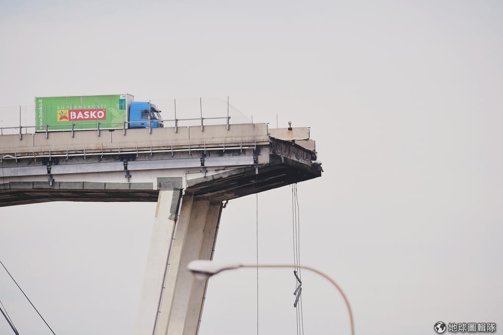 一輛卡車停在熱那亞的「莫蘭迪」大橋上,它的前方就是落差 50公尺的地面。