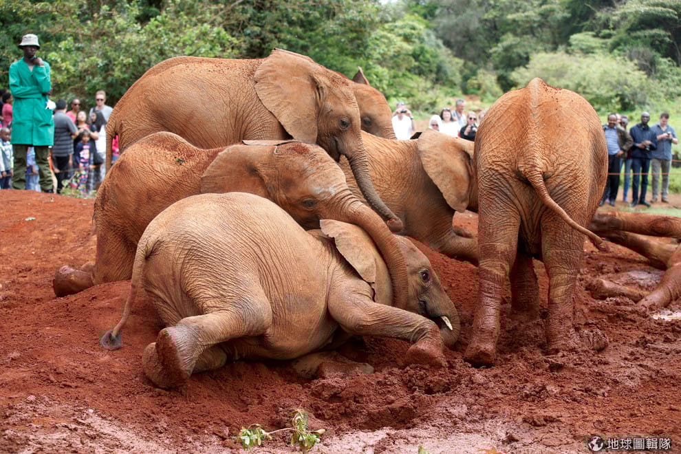 圖為今年 4月,在肯亞的奈洛比國家公園大象孤兒院,一隻隻大象在保育員的看顧下開心地玩耍。