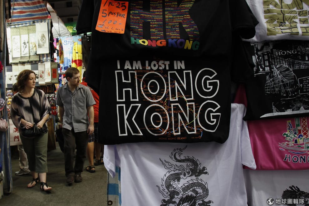 在紀念品店裡,一件T-shirt寫著「我在香港迷了路」。