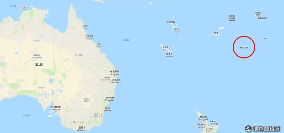 東加王國通稱東加,位於太平洋西南部,是一個由 172個島嶼組成的國家,面積約有 748平方公里。圖為東加王國的地理相對位置。