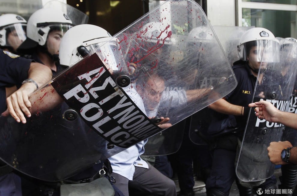 照片中是2011年的希臘,當時希臘政府為了要取得國際援助資金的挹注,就通過一連串砍社會預算的修法,這在當時引起大規模的抗議和示威行動。