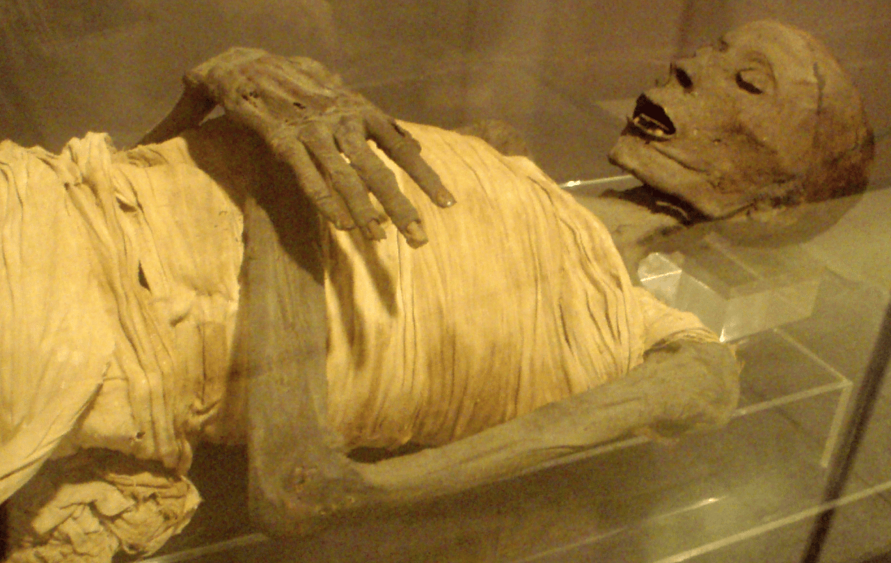 畫面中是古埃及後王朝時期留下的木乃伊,可以看到他的處理方式,與「弗萊德」不太一樣。