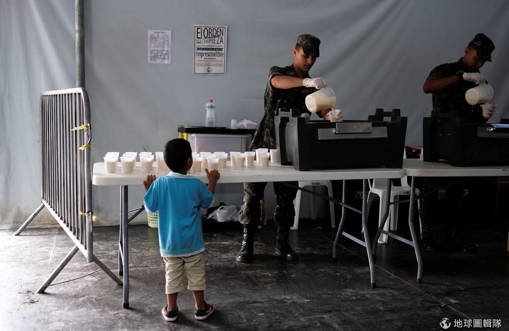 本月 8號在城鎮帕卡賴馬,巴西軍人在小男孩的觀看下,正忙著準備咖啡牛奶,這裡是替委內瑞拉人設置的難民營。
