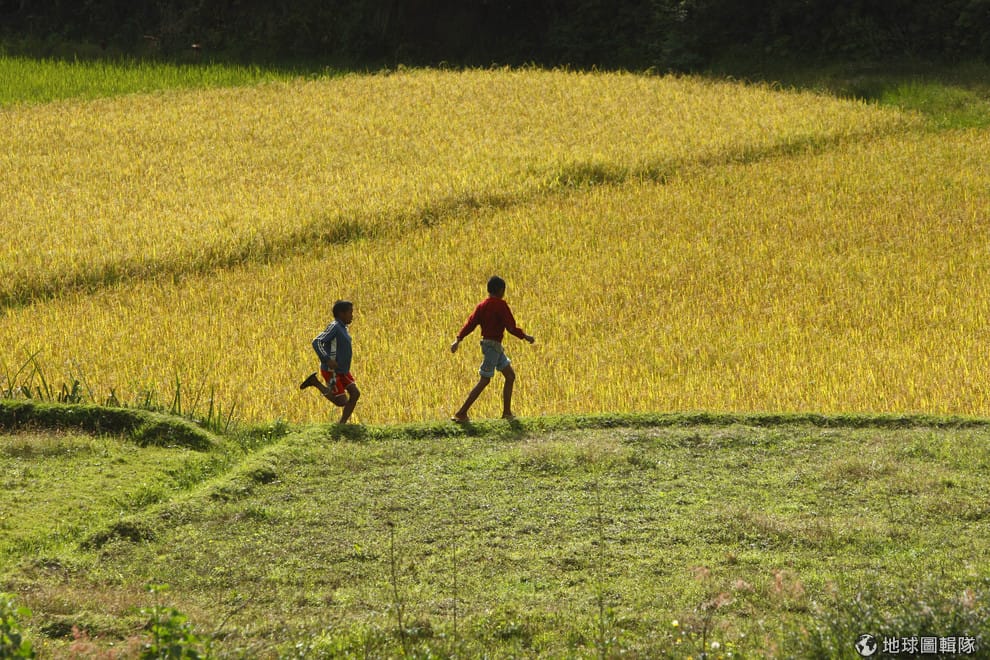 圖為 2012年4月,在馬達加斯加首都安塔那那利佛(Antananarivo)附近的村莊,孩子們在稻田上奔跑。