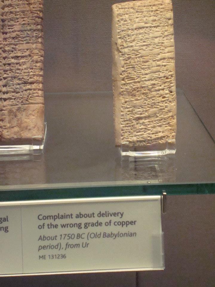 在西元前 1750年的美索不達米亞,有一座名為烏爾(Ur)的古城,這座城市就位在今天伊拉克巴格達南方的納西里耶(Nasiriyah)附近。在這座古城中,20世紀初英國考古學家伍利爵士(Sir Leonard Wooley)發現了一件很有意思的玩意──一封刻在泥板上的客訴信。