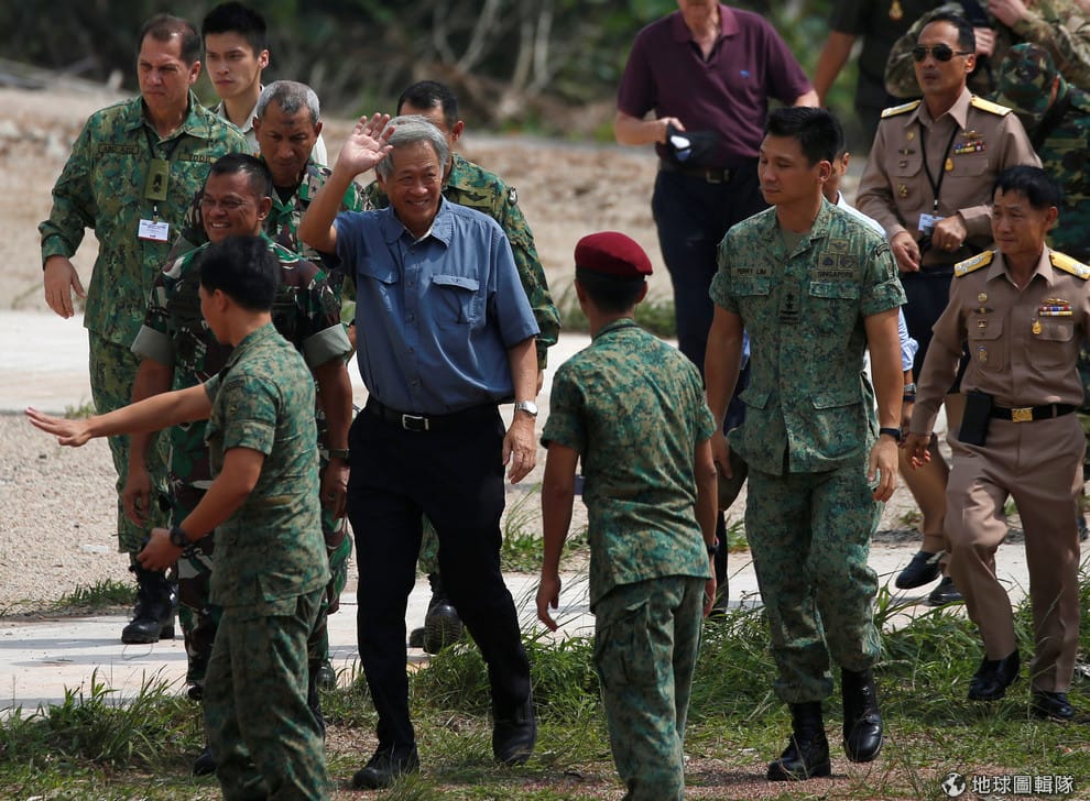 2016年,新加坡國防部長黃永宏(藍衣者)抵達東南亞國協反恐演習現場。黃永宏表示,在國家壯大國防的需求前,個人追求要擺在一邊。